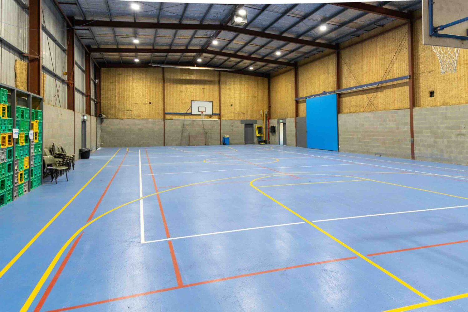 A full-size indoor gym hall with conference-style function room features, ideal for large-group sessions, assemblies, indoor sports or rainy-day programs.
