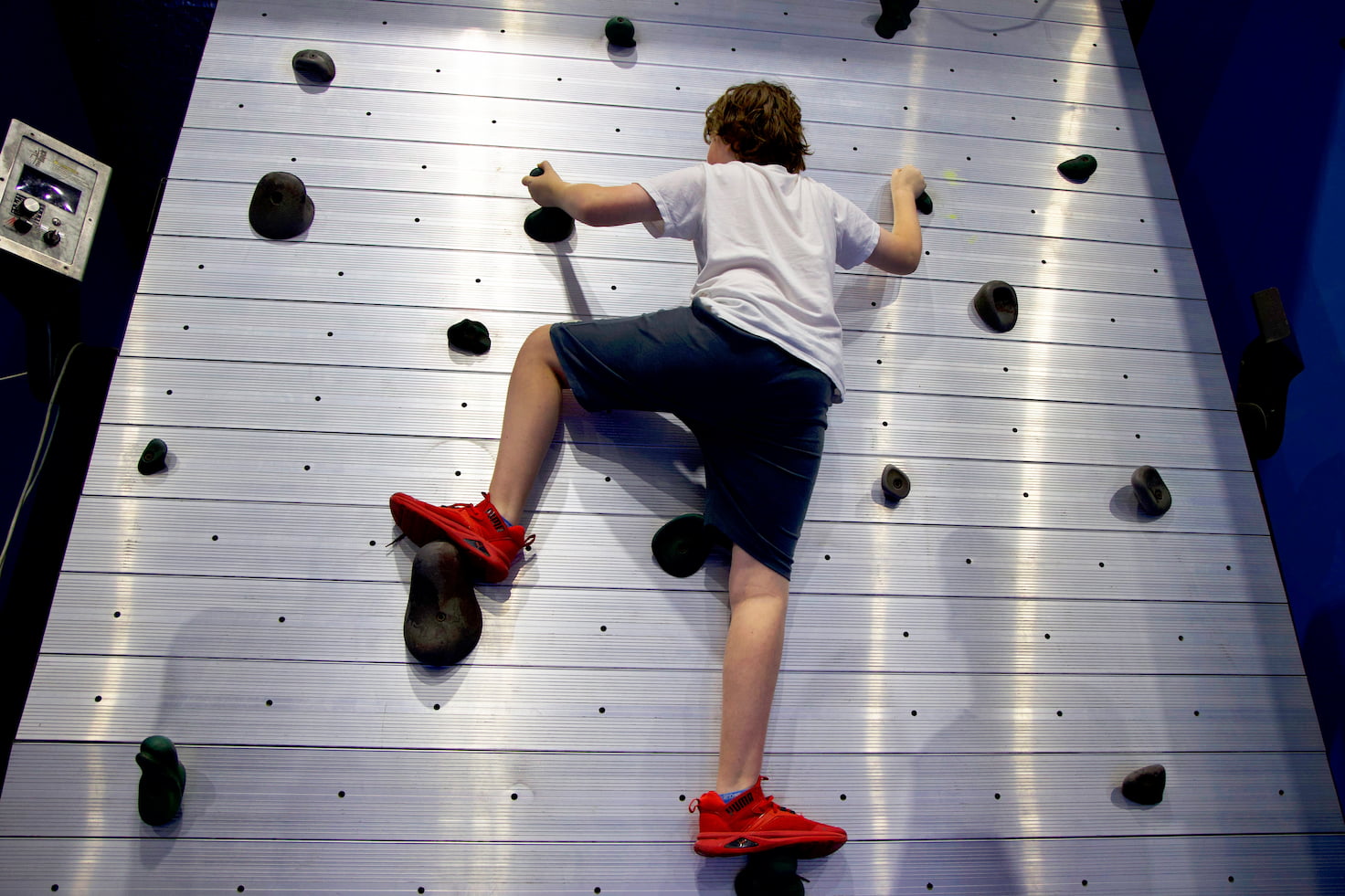 A full-size indoor gym hall with a climbing wall, ideal for large-group activities, assemblies, indoor sports or rainy-day programs