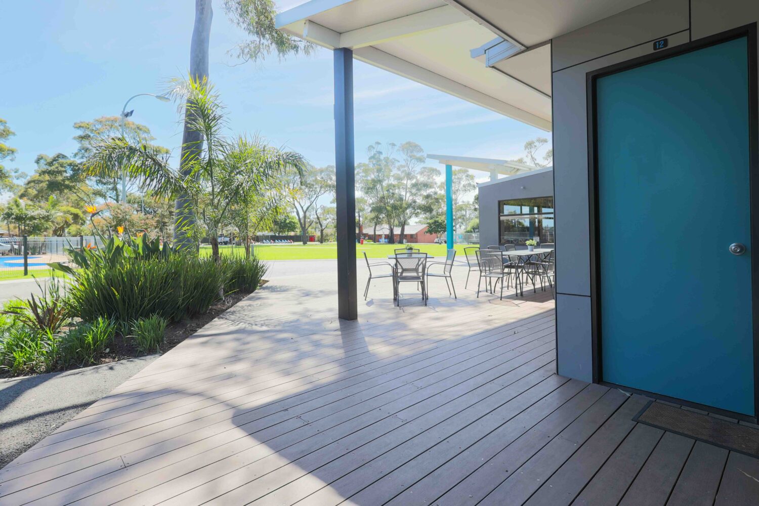 Deck and verandah areas around lodges and common buildings give campers relaxed, outdoor-ready spaces to gather, socialise or reflect